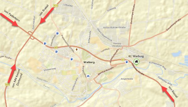 Aus Richtung Autobahn oder aus Richtung Brakel auf die B7 Richtung Warburg fahren